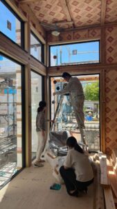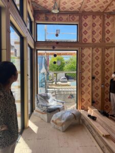 スタジオ・ノイの奥田様に過去の資料を頂き、弊社でモックアップを作成。 現場でモックアップを掲げながら、リビングコーナーに置くミノッティのパーソナルチェアをのバランスを下田結花さんにアドバイスを頂きながら位置を決定。