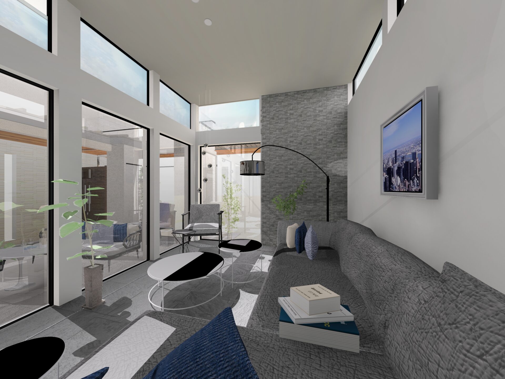 テラス側には背の高い窓が並んでいて、室内にいながらも広々とした開放的な空間になっています。